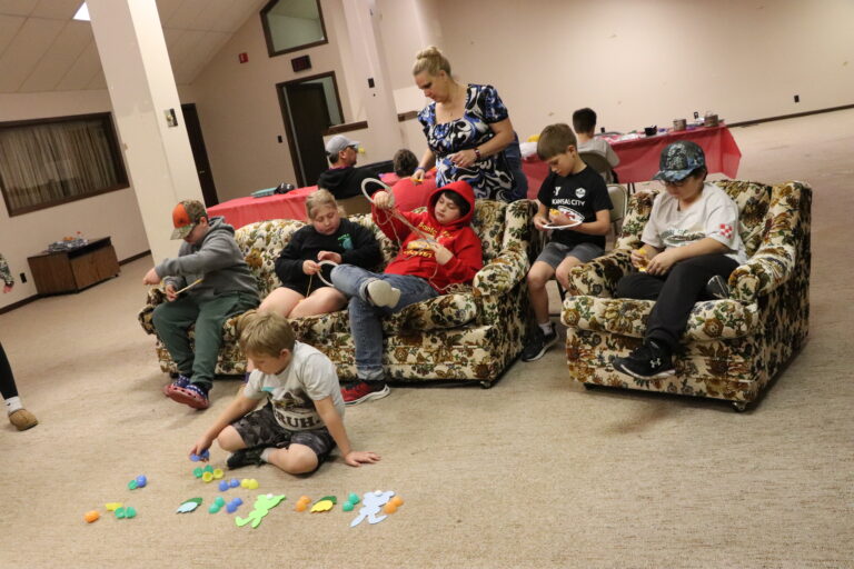 On Thursday night, March 5, members of the Alma 4-H Club met at the Alma Communication building to create an Easter craft. Younger kids made Easter buntings and older members made mini wreaths. In front, working on a bunting: Charlie Schreiman. Seated on the couch, from left: Conner Stephens, Riley Schreiman, Colstyn Bergman receiving assistance from 4-H Leader Tiffany Bergman, Logan Lovercamp, Owen Ford. See more from this event on page 5. (Santa Fe Times photo by Klarissa Olvera)