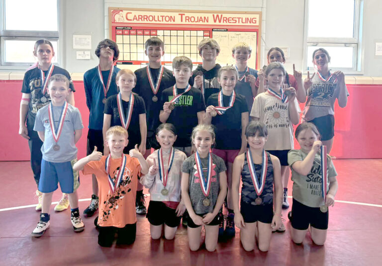 This past weekend, members of Carrollton’s youth wrestling team travelled to Springfield to participate in the state wrestling championship held March 13-15. London Houk, 8u 55, placed 5th; Braelynn Chavez, 10u 65, placed 6th; Lillian Brotherton, 14u 110, placed 6th; Bentli Rushmore, 14u 105, placed 6th; Mylah Renzelman, 8u 60, State Runner up; Ainsley Renzelman, 10u 55, State Runner Up; Abigail Montgomery, 12u 120, State Runner Up; Audrey Jones, 8u 75, placed 4th; Brayden Steadham, 12u 115, placed 5th; Kiptyn Wilson, 10u 90, placed 4th. Front row, from left: Kye Chavez, London Houk, Ainsley Renzelman, Mylah Renzelman, Audrey Jones. Second row: Marshall Bowlen, Braelynn Chavez, Kiptyn Wilson, Heynlea Bultmann, Tayona Floyd. Back: Abigail Montgomery, Conner Vaughn, Bentley Feagan, Xavier Renzelman, Brayden Steadham, Lillian Brotherton, Bentli Rushmore. Not pictured: Merrah England, Naveah Williams. (Submitted photo)