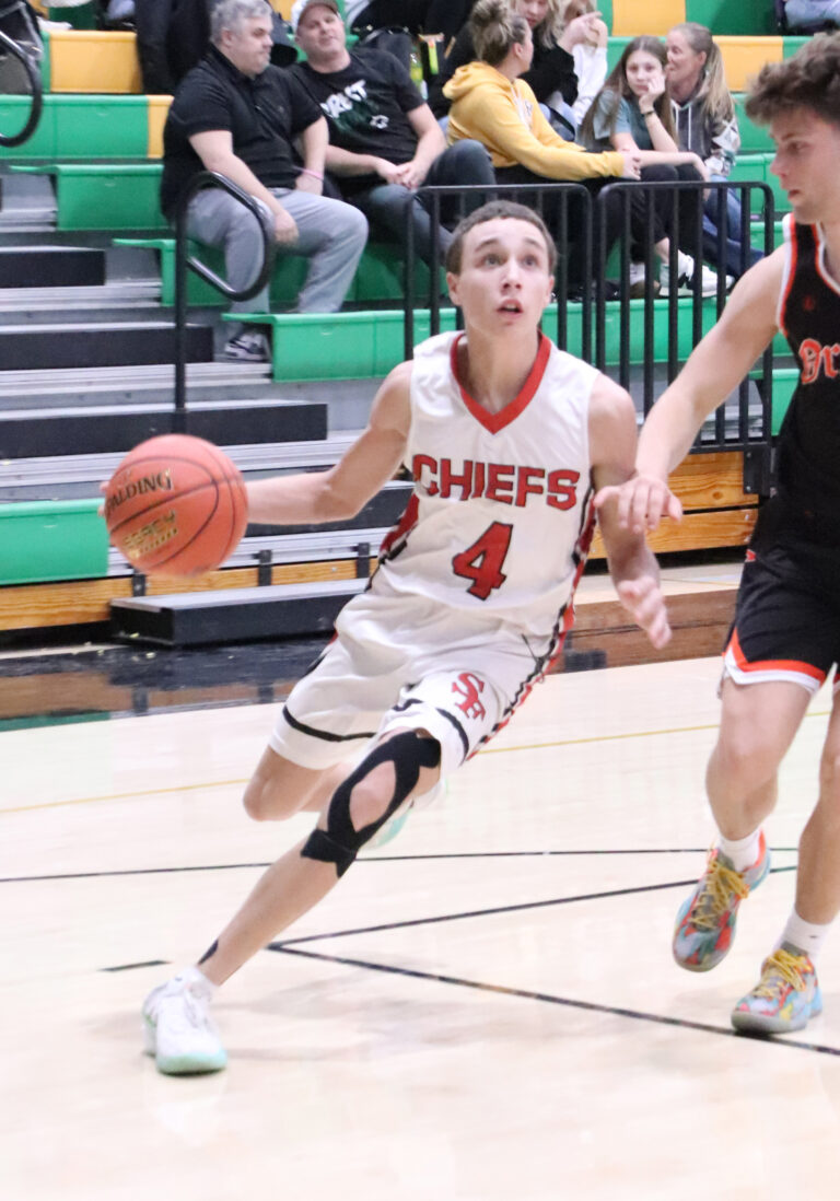 The Chiefs were on the road to finish up the regular season last Friday night at Cole Camp to take on the Blue Birds. Logan Wilsie had 4 in the first and Will Leabo hit a three, but it was 12-9 CCHS after one quarter. Santa Fe heated up in the second frame going for 16 points, with Korben Dierking dropping in a pair of treys. The halftime score was knotted up at 25 all.
