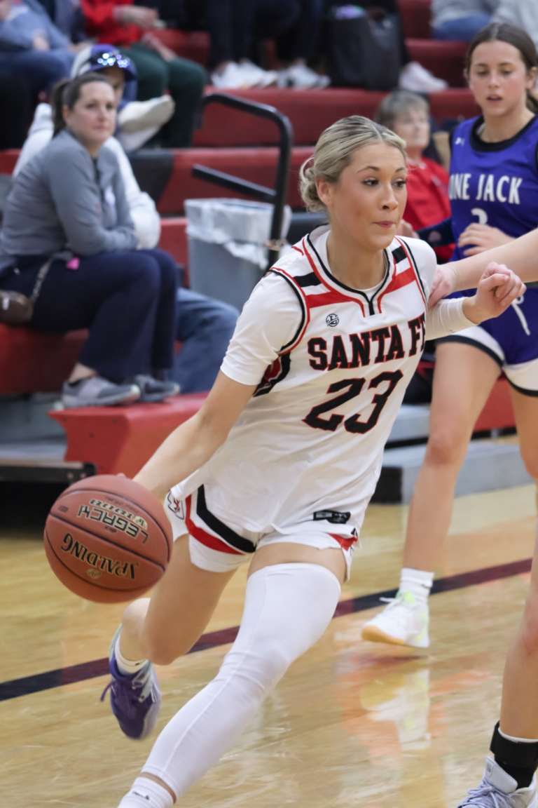 The Lady Chiefs hosted the Concordia Lady Orioles to town on Valentine’s Eve and Court Warming. With a supper, and a bunch of fundraising goodies lining the main hallway, the ball was tipped and Santa Fe jumped out on top 5-1. Later, Mia Lark got a put back to make it 9-6 at the end of the first quarter.