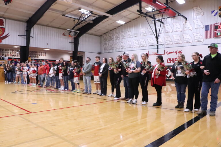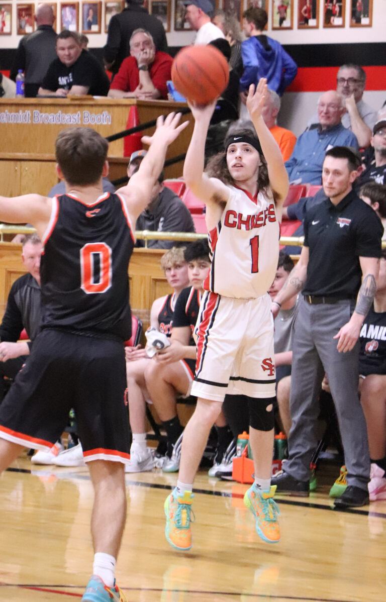 It was a Highway 23 showdown last Friday night at Santa Fe as the Chiefs took on the Concordia Orioles. The last meeting was in the conference tourney with CHS winning 46-39. Junior Will Leabo started the scoring party for the Chiefs getting a three ball to drop, then Logan Wilsie scored, four straight, Leabo got another bucket and CHS burned a timeout to talk things over down 9-0. Ethan Finkeldei scored the next basket, and at the 3:28 mark Concordia got on the board for 11-2. The Orioles showed some life though, drawing the quarter to a close at 13-7.