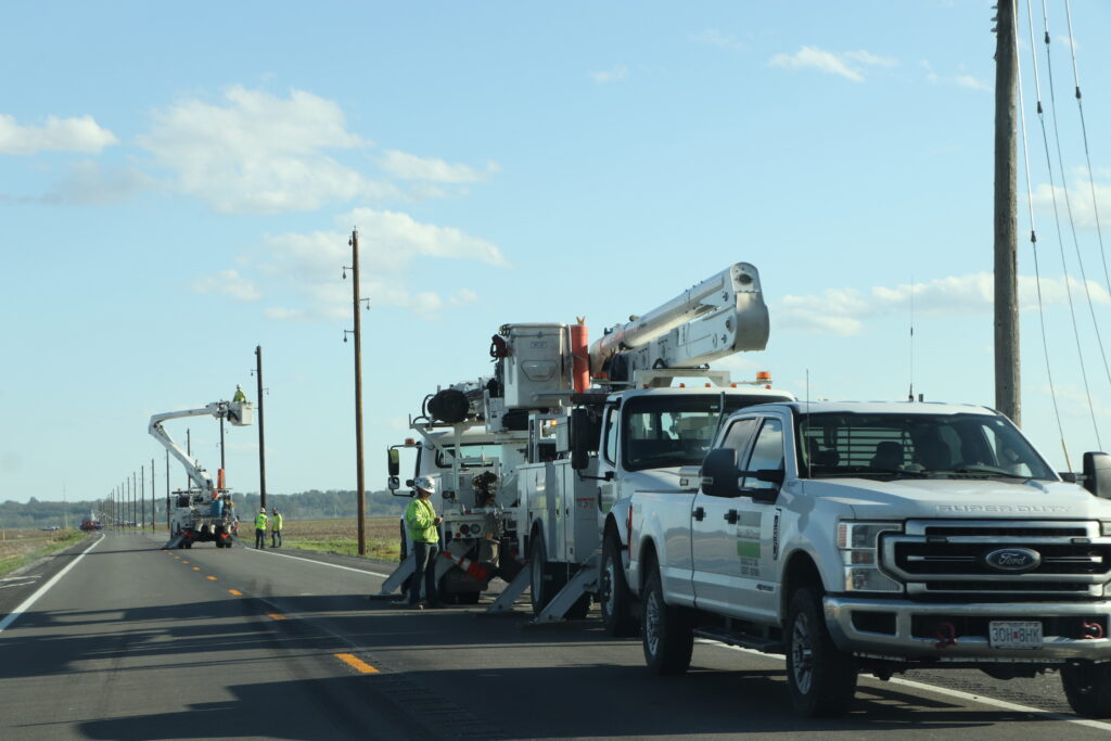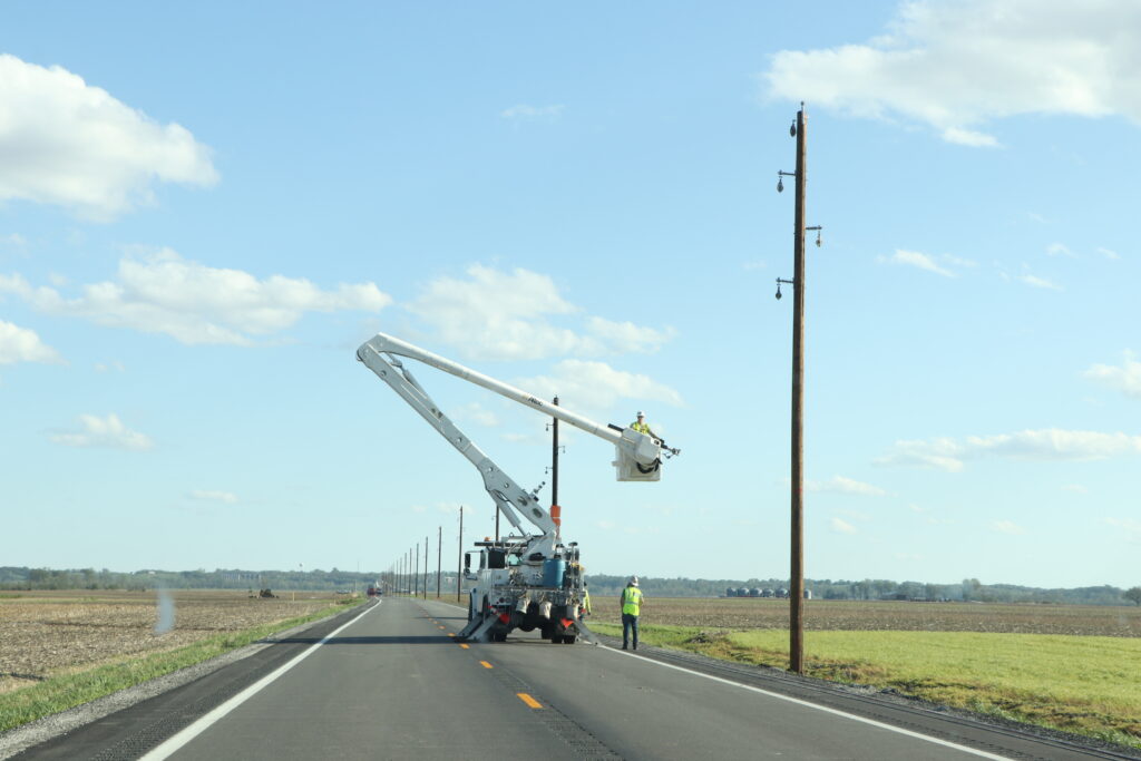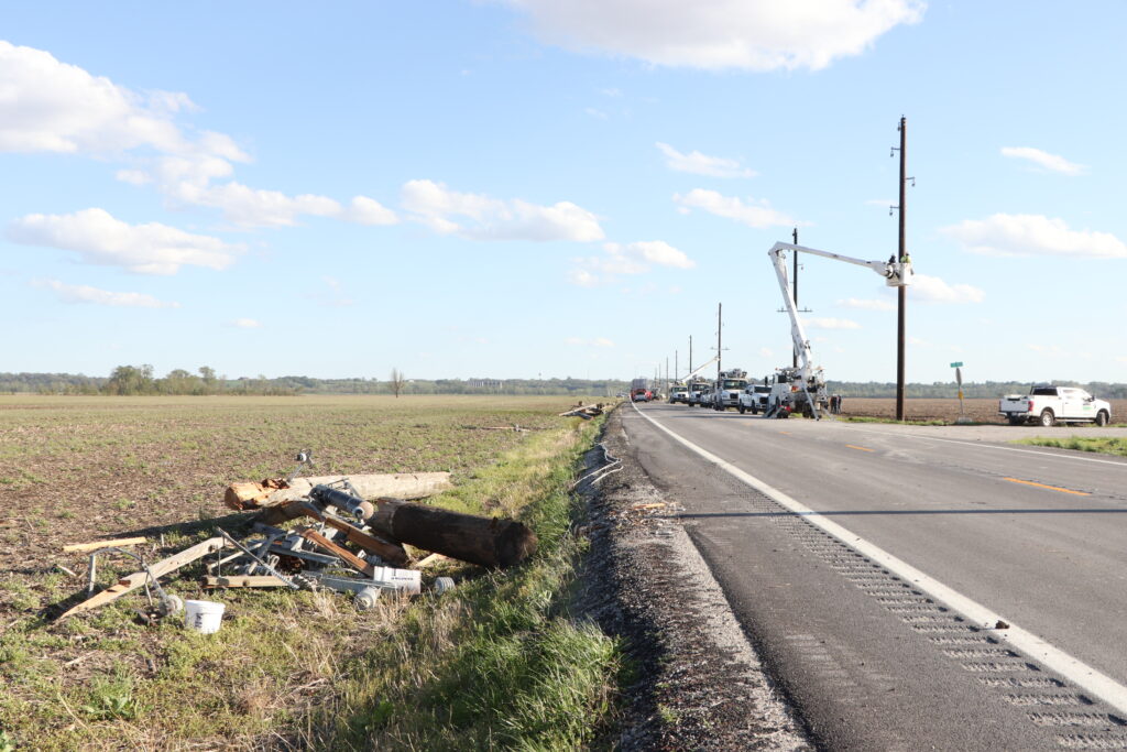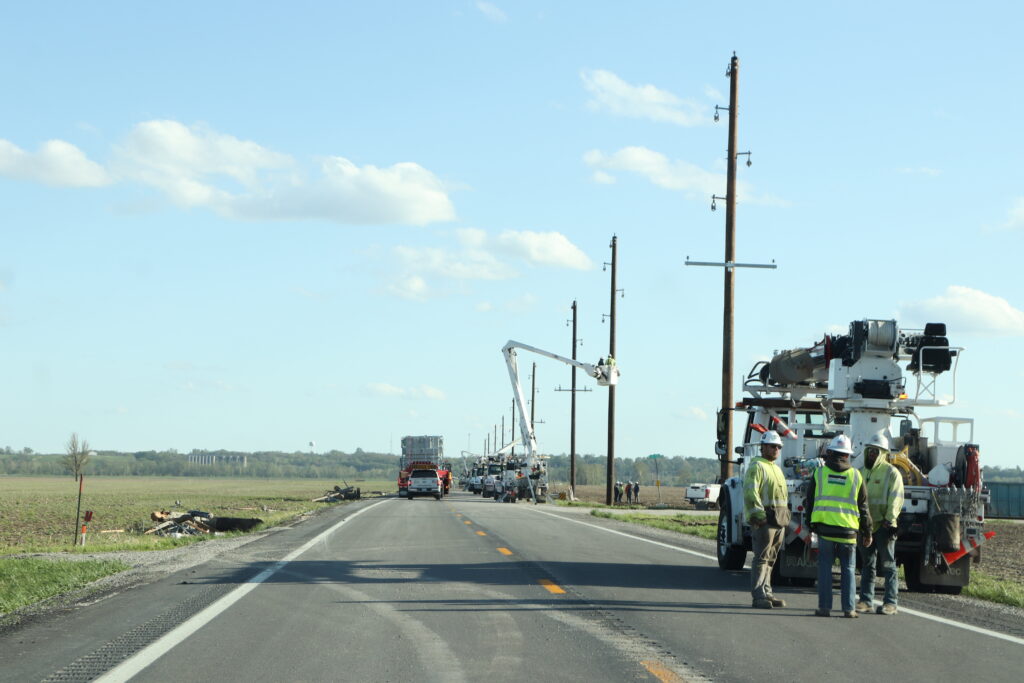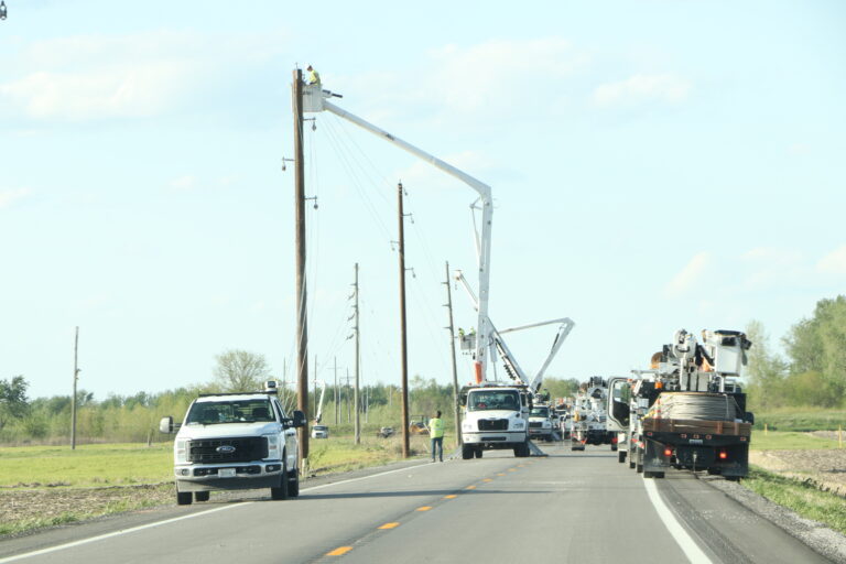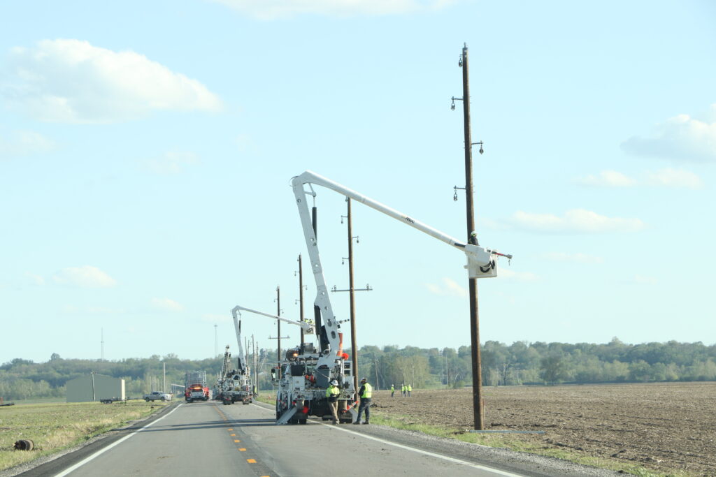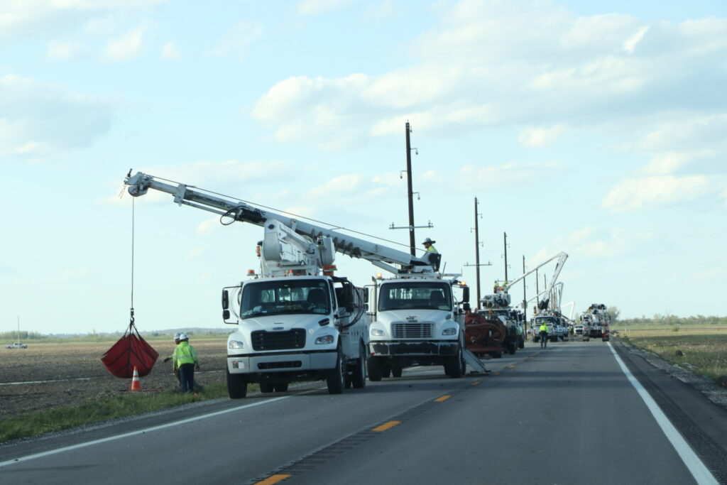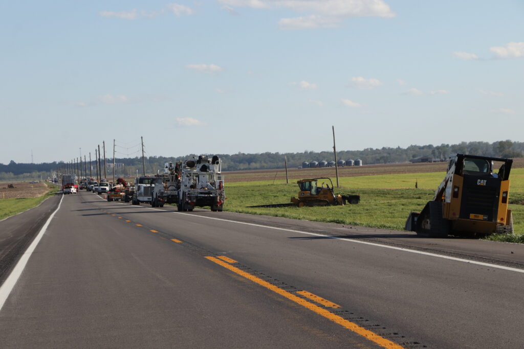 Along Hwy 65, between the Waverly Bridge and Bowdry, a stretch of telephone poles were snapped over into the highway. Crews with MoDOT, Evergy and Black & McDonald of Kansas City, which equated approximately 120 workers, worked all day Saturday to replace 37 poles over a two-mile stretch. They reopened Hwy 65 late Saturday evening, but closed it again Sunday morning to string power lines.